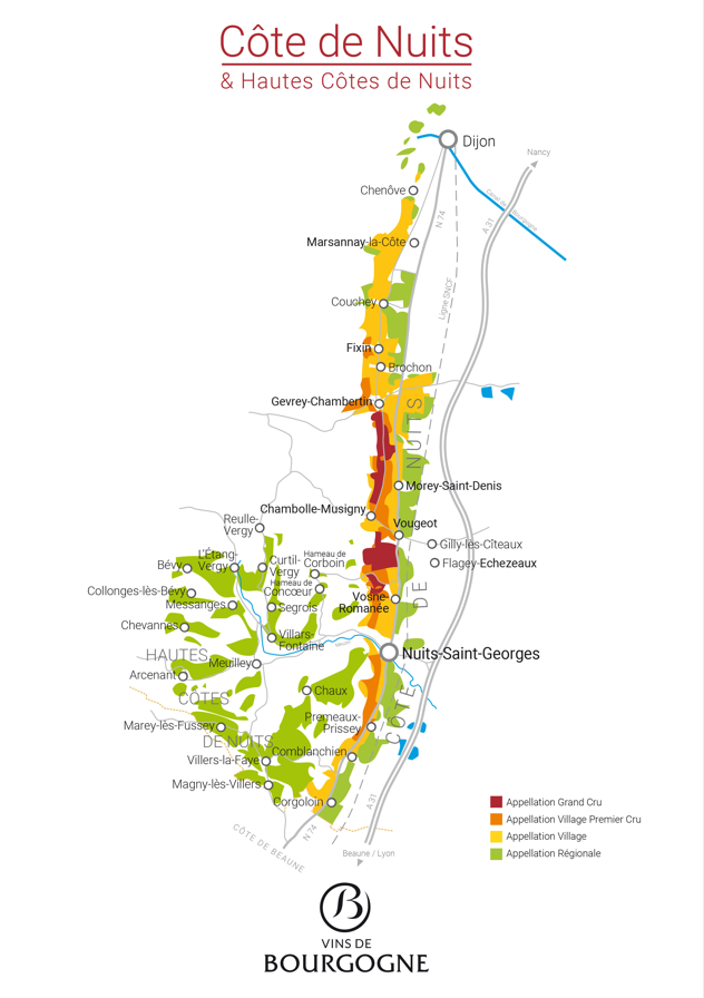 En Bourgogne, dans le département de la Côte d'Or, le vignoble de la Côte de Nuits est situé au sud de la ville de Dijon. On le surnomme "Les Champs-Elysées" de la Bourgogne. La route des vins traverse, des villages célèbres dont les noms ont fait le tour du monde : Gevrey-Chambertin, Vosne-Romanée, Nuits-Saint-Georges... Cette carte peut vous servir pour faire de l'oenotourisme en Bourgogne