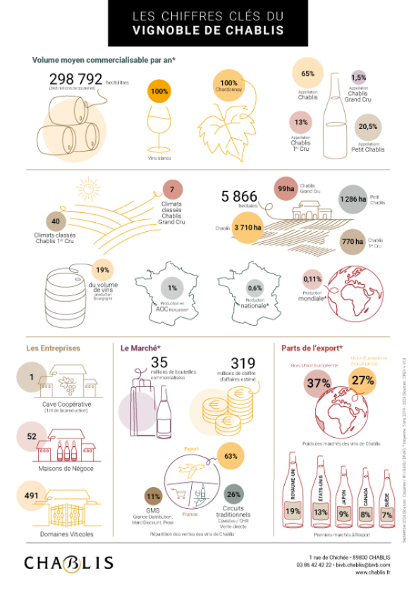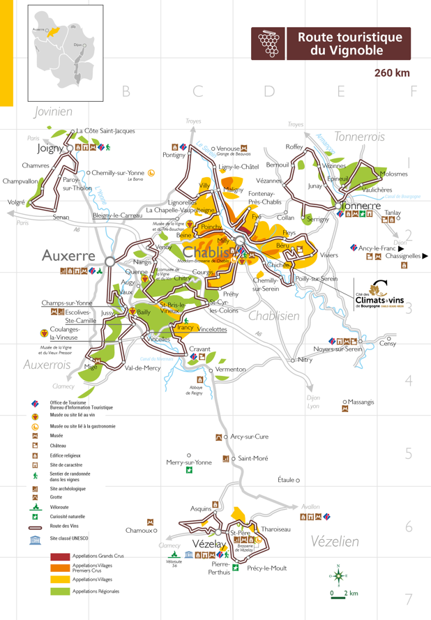 En Bourgogne, dans le département de l'Yonne, le vignoble de Chablis occupe les coteaux qui bordent la vallée du Serein. L'Auxerrois se situe au sud/sud-est de la ville d'Auxerre. Le Tonnerrois se trouve dans la vallée de l'Armançon à proximité de la ville de Tonnerre. Le Vézelien est au sud du département autour de Vézelay. Le Jovinien est tout au nord du département, il domine Joigny. Le Châtillonnais se situe à 70 km au nord-ouest de Dijon et 45 km à l'est de Tonnerre. Cette carte peut vous servir pour faire de l'oenotourisme en Bourgogne