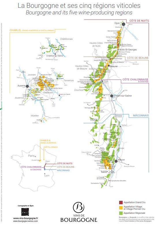 La carte de la Bourgogne et de ses cinq régions viticoles, avec du Nord au Sud, les vignobles de Chablis, Grand Auxerrois et le Châtillonnais, la Côte de Nuits et Hautes Côtes de Nuits, la Côte de Beaune et Hautes Côtes de Beaune, la Côte Chalonnaise et Côtes du Couchois et enfin, le vignoble du Mâconnais. Cette carte peut vous servir pour faire de l'oenotourisme en Bourgogne