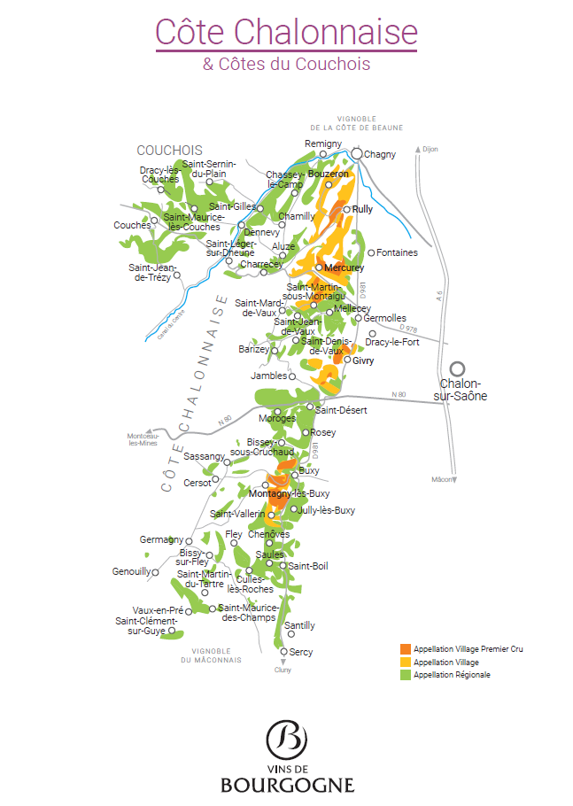 En Bourgogne, dans le département de la Saône-et-Loire, le vignoble de la Côte Chalonnaise se situe entre la Côte de Beaune au nord et les monts du Mâconnais au sud. Il est situé au nord et au sud de la ville de Chalon-sur-Saône. Le Couchois est situé au sud des Hautes Côtes de Beaune, un peu plus à l’ouest, de l’autre côté du canal du Centre. Cette carte peut vous servir pour faire de l'oenotourisme en Bourgogne.