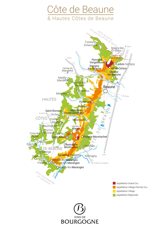 En Bourgogne, dans le département de la Côte-d'Or, le vignoble de la Côte de Beaune s'étend entre Ladoix-Serrigny et le coteau des Maranges. La Côte de Beaune égrène des noms aussi célèbres qu'évocateurs : Aloxe-Corton, Beaune, Pommard, Volnay, Meursault, Puligny-Montrachet… Cette carte peut vous servir pour faire de l'oenotourisme en Bourgogne.